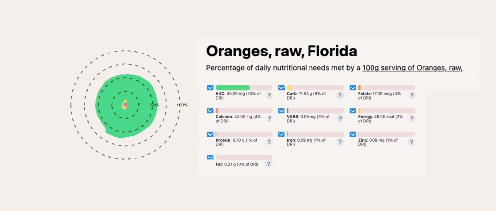 - Data are backed by the USDA (nutritional needs) and USDA FoodData database (nutrients); a unique link to the data is provided on every selection