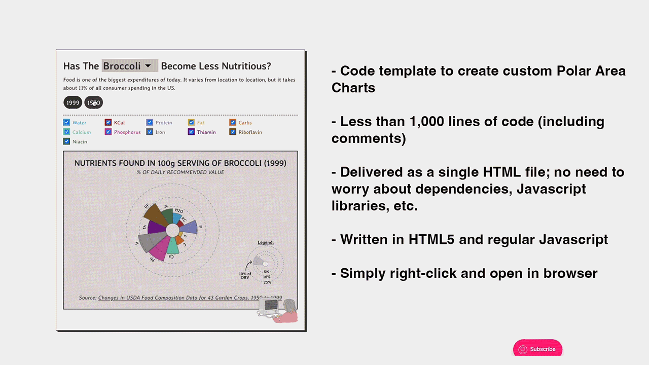 Get a behind-the-scenes look at this custom made polar area chart with its html file. Simply select a food from the dropdown list and get a custom nutrition graph made.